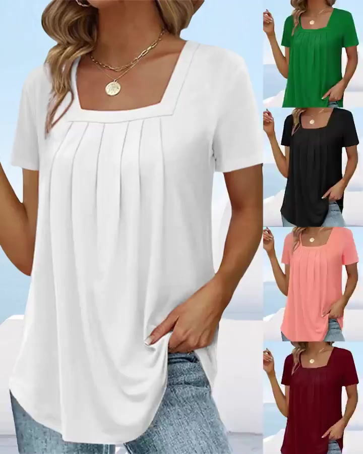 🎁 Μονόχρομος κοντομάνικο πλέουζάκι με τετράγωνη γραμμοκοψη-GR