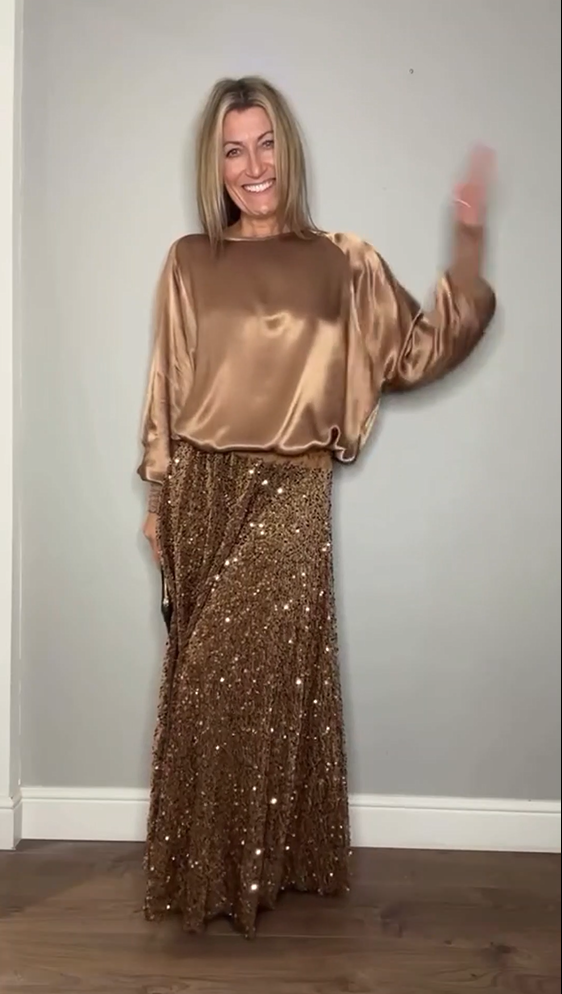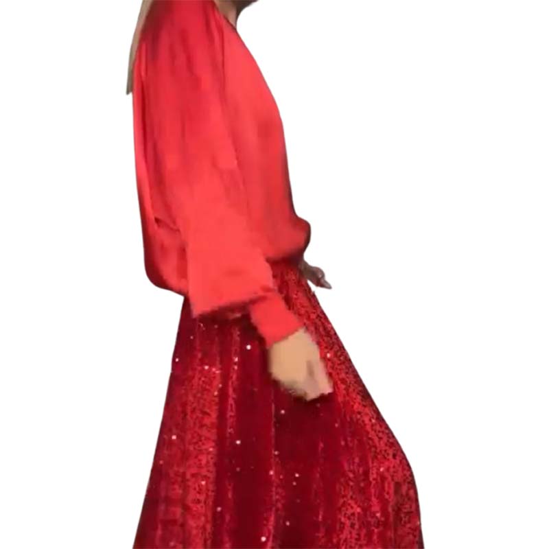 KOKYBĖS MEDŽIAGOS: Minkštas, orui pralaidus viršus suteikia komfortą visą dieną, o blizgutinis maksi sijonas pagamintas iš patvarių blizgučių, kurie išlieka nepažeisti ir išlaiko blizgesį net po pakartotinio dėvėjimo.