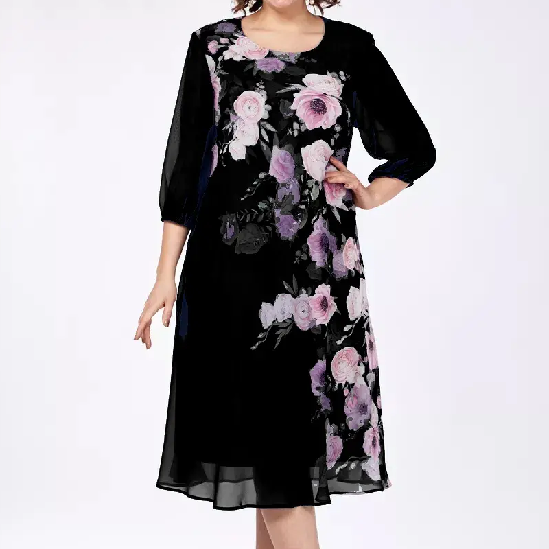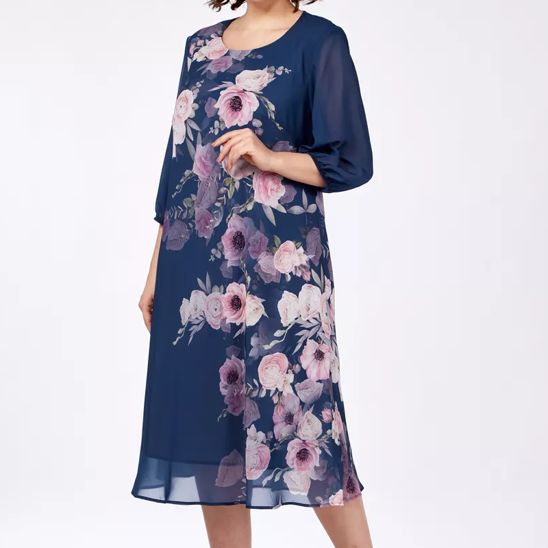 Elegantiška gėlėto rašto šifono suknelė su apvalia iškirpte-LT