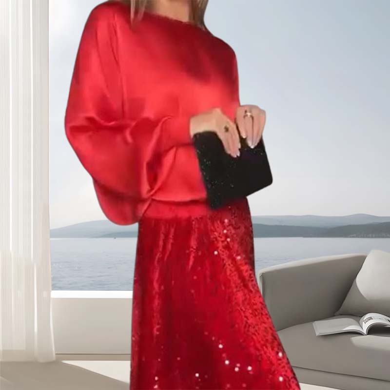 Dámsky dvojdielny top s dlhým rukávom a flitrovou sukňou-SK
