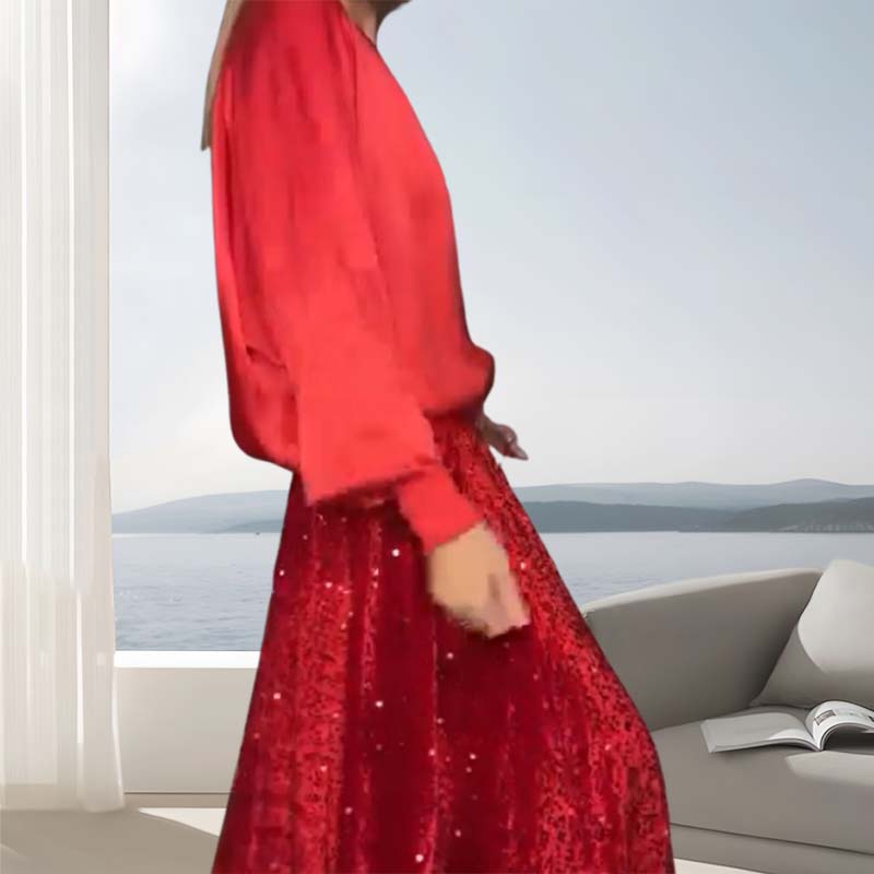 KVALITNÉ MATERIÁLY: Mäkký, priedušný top poskytuje celodenné pohodlie, zatiaľ čo flitrová maxi sukňa je vyrobená z odolných flitrov, ktoré zostávajú neporušené a zachovávajú si lesk aj po opakovanom nosení.
