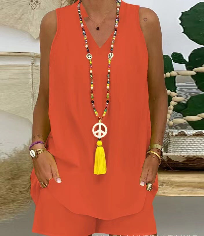 Elegantná dvojdielna súprava: krátky rukáv výstrih do V + šortky-SK