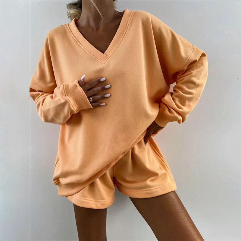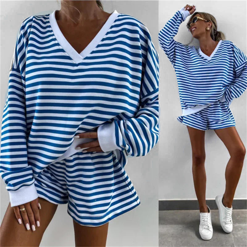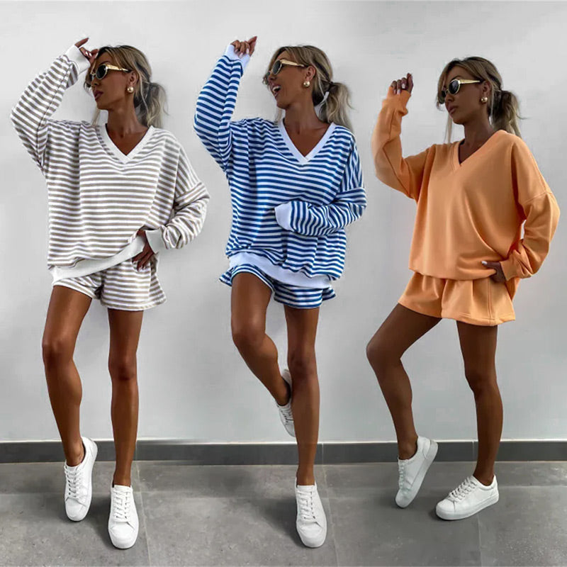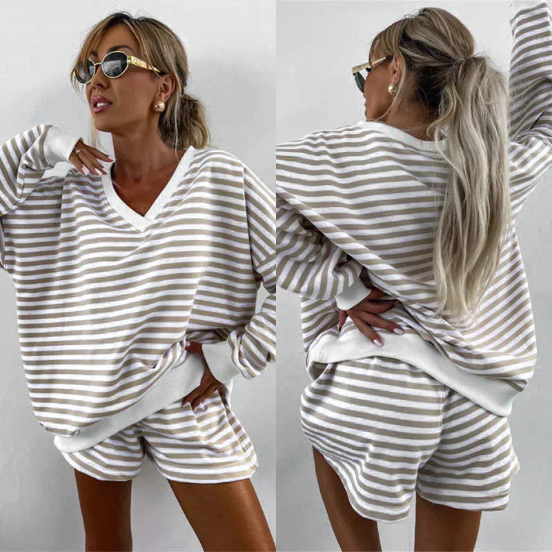 Į paketą įeina: 1 * Moteriška dvojdielna apranga Dryžuota V formos iškirptė Laisvas virchus ir šortai